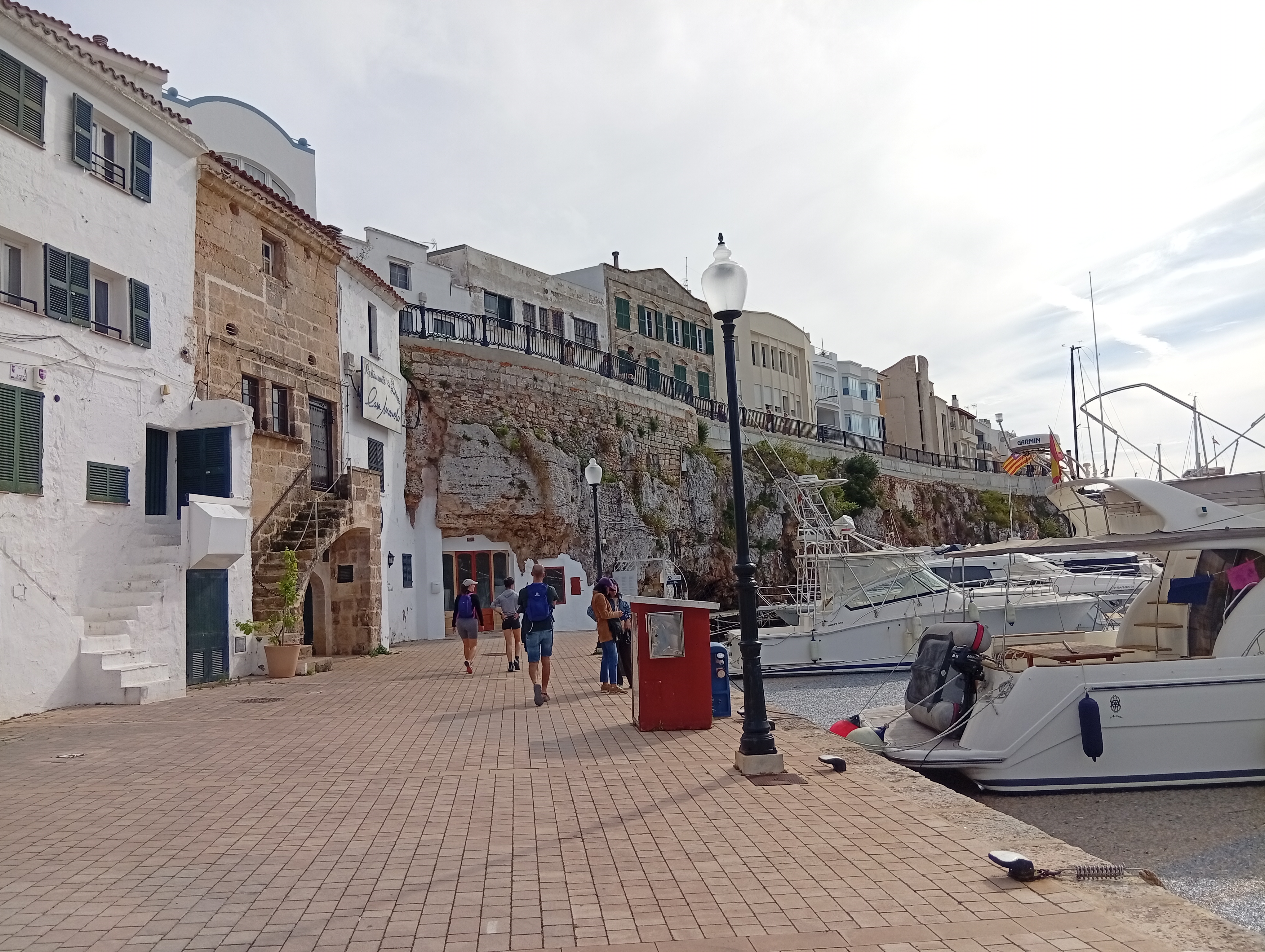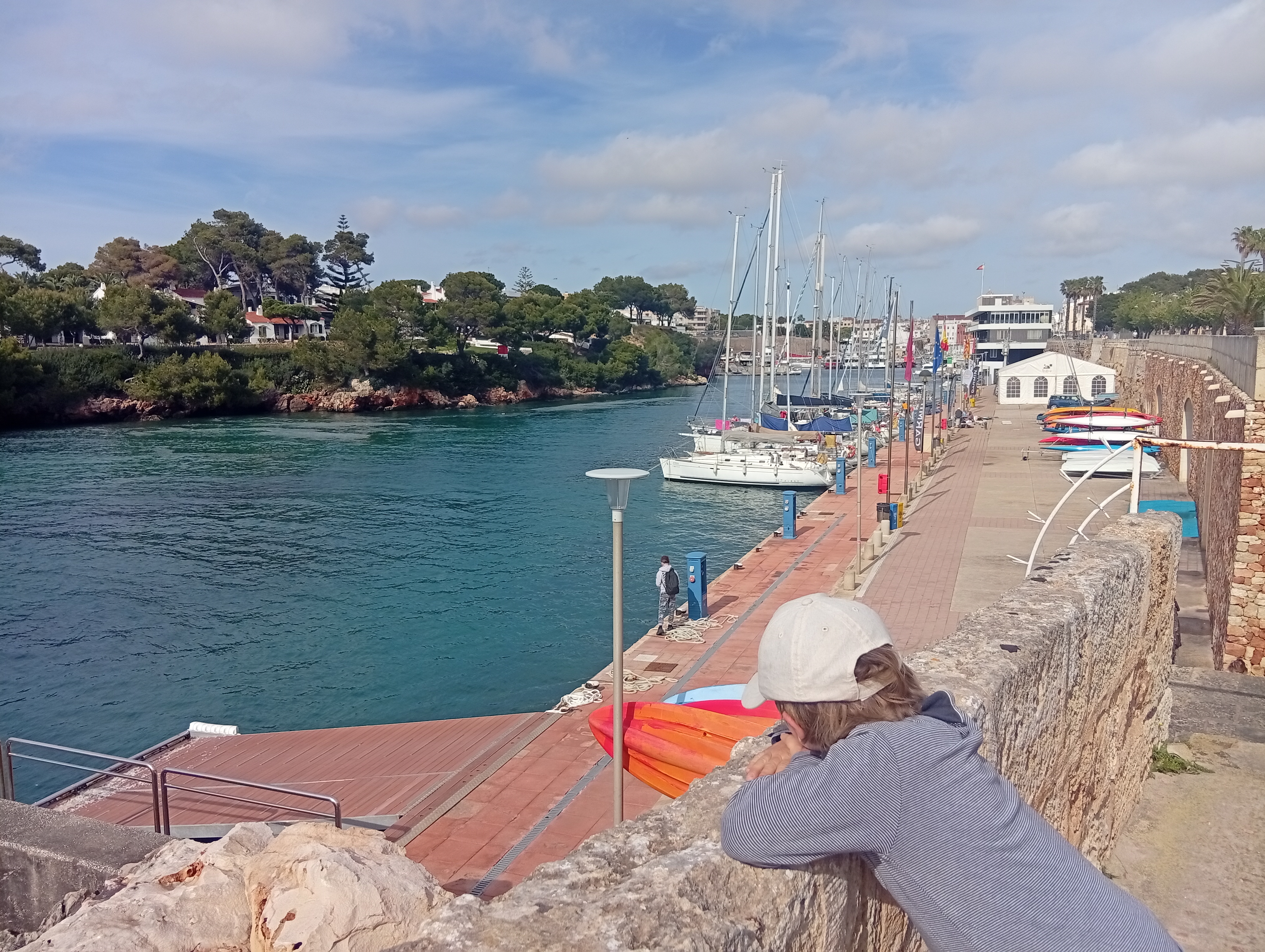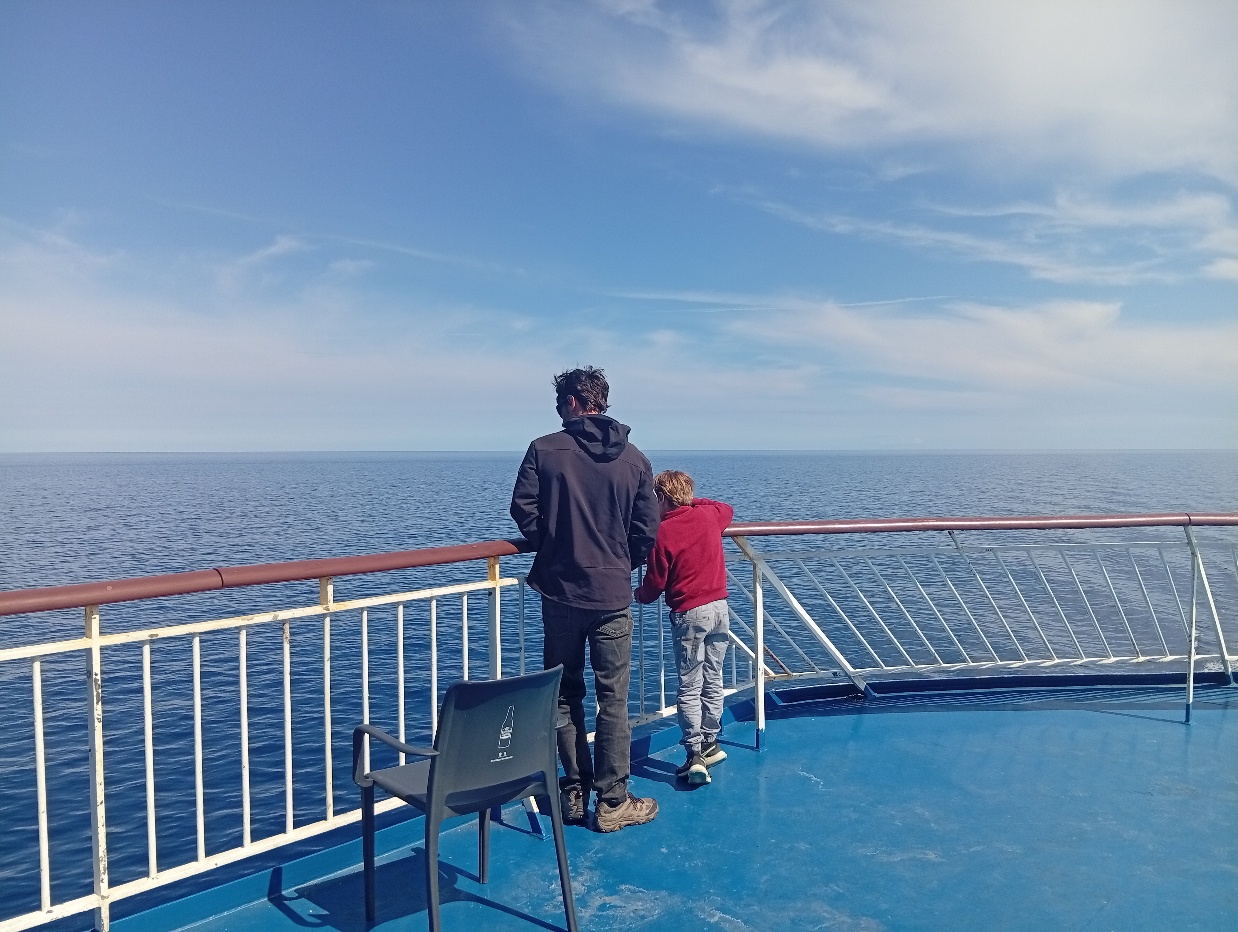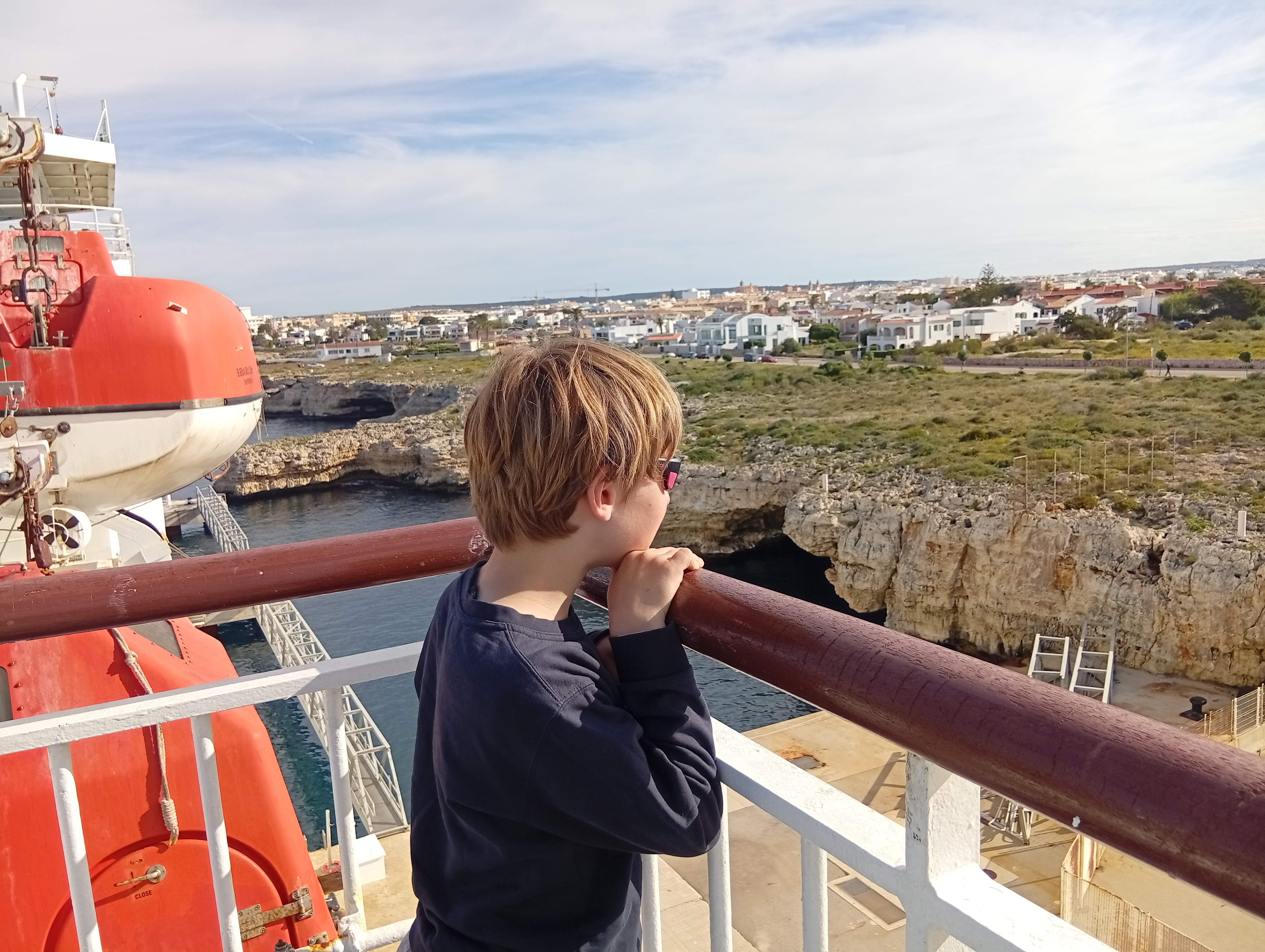 Ce matin, il est temps de dire au revoir à Minorque, déjà! On a le coeur un peu gros... Et c'est la routine maintenant, on s'enregistre, on fait la queue sur le port puis on embarque Basile dans les cales et on va s'installer sur le pont pour voir l'île s'éloigner.